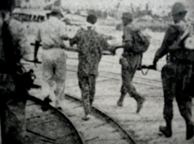 De gevangen parachutist wordt weggevoerd. Geblinddoekt, om te voorkomen dat de Indonesiƫr alles in zich op kan nemen. Dikwijls zijn de para's opgelucht als hun tijd in de bus-bush is afgelopen. Ze zijn er niet speciaal op getraind.