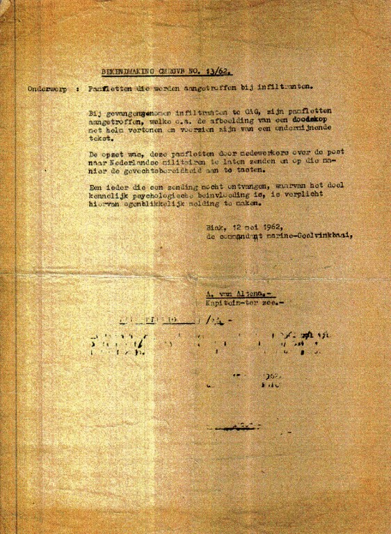 Bij gevangengenomen infiltranten te GAG zijn pamfletten aangetroffen, welke o.a de afbeelding van een doodskop met helm vertonen en voorzien zijn van een ondermijnende tekst.