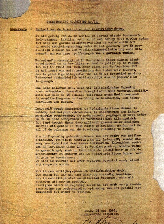 Als de papoea's gebruik makende van het recht van zelfbeschikking, vrijelijk aansluiting bij Indonesië, zouden kiezen, zou Nederland deze keuze aanvaarden. Zolang het recht van de bevolking eigen lot te bepalen niet op andere wijze is gewaarborgd, rust op Nederland de plicht haar en ook de Nederlanders en anderen die in Nederlands Nieuw-Guinea verblijven te beschermen.