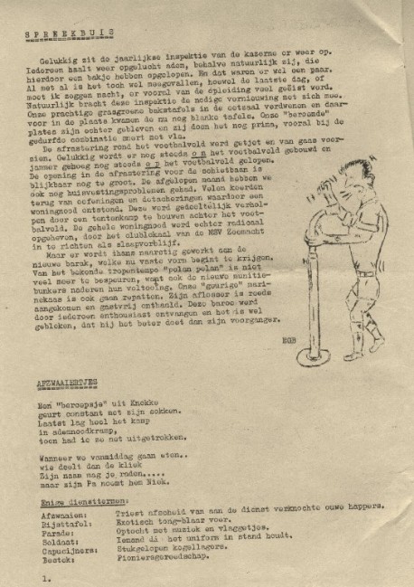 De afrastering rond het voetbalveld werd getjet en van gaas voorzien. Gelukkig wordt er nog steeds o m het voetbalveld gebouwd en jammer genoeg nog steeds o p het voetbalveld gelopen. De opening in de afrastering voor de schietbaan is blijkbaar nog te groot. De afgelopen maand hebben we ook nog huisvestingsproblemen gehad. Velen keerden terug van oefeningen en detacheringen waardoor een woningnood ontstond. Deze werd gedeeltelijk verholpen door een tentenkamp te bouwen achter het voetbalveld. De gehele woningnood werd echter radicaal opgeheven door het clublokaal van de MSV Zeemacht in te richten als slaapverblijf.