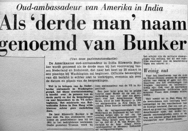 De Amerikaanse oud-ambassadeur in India Ellsworth Bunker wordt genoemd als de derde man bij het vooroverleg tussen Nederland en Indonesië, dat naar het heet op 20 maart in een plaatsje bij Washington zal beginnen. Officiële bevestiging van dit bericht is echter niet te verkrijgen , evenmin als over de datum en plaats van besprekingen.