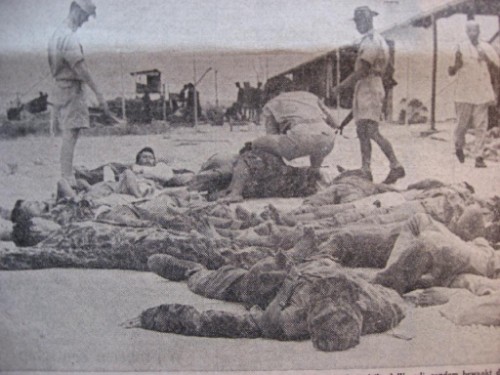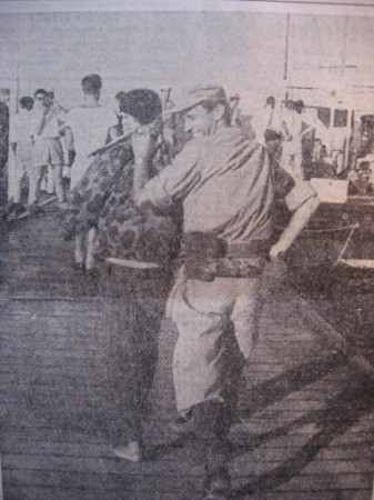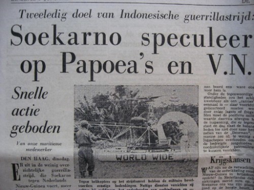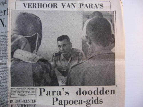 Een krachtige mariniershand van Cor Venix, leidt een geblinddoekte Indonesische parachutist naar het Marine-vaartuig, dat gevangenen overbracht naar het eiland Woendi. Alleen het camouflagehemd bleef over van de martiale verzameling uniformstukken, waarmede Soekarno zijn ,,bevrijders uitdoste. De blindoek deed de para,s de moed helemaal in de schoenen zinken ( voor zover ze die al niet in het oerwoud waren kwijtgeraakt). Met hun jungleboots liepen wij inmiddels rond, want onze schoenen waren al helemaal verrot!