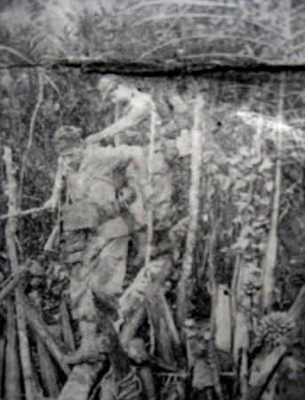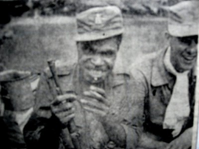 Dit is Basilius Jagoimo, de politieman, die tijdens de patrouille een para ving. Door kampongbewoners waren de militairen gewaarschuwd, dat er een para in de buurt zat, Jagoimo trok zijn uniform uit en wandelde alleen gekleed in een broekje, op blote voeten en slechts bewapend met een kapmes, de kampong in. Spoedig sprong hij de Indonesiƫr in de nek, ontwapende hem onder bedreiging met het kapmes en voerde hem mee.