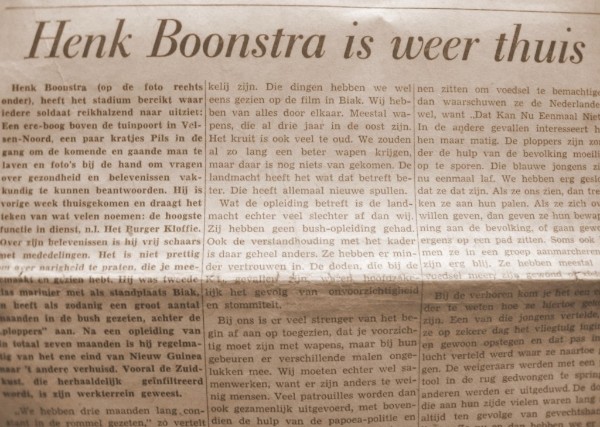 Henk Boonstra ( op de foto rechts ) heeft het stadium bereikt waar iedere soldaat reikhalzend naar uitziet: Een ere-boog boven de tuinpoort in Velsen-Noord, een paar kratjes Pils in de gang om de komende en gaande man te laven en foto's bij de hand om vragen over gezondheid en belevenissen vakkundig te kunnen beantwoorden. Hij is vorige week thuisgekomen en draagt het teken van wat velen noemen : de hoogste functie in dienst, n.l Het Burger Kloffie. Over zijn belevenissen is hij vrij schaars met mededelingen. Het is niet prettig om over narigheid te praten, die je meegemaakt en gezien hebt. Hij was tweede klas marinier met als standplaats Biak, en heeft als zodanig een groot aantal maanden in de bush gezeten, achter de ,, ploppers " aan. Na een opleiding van in totaal zeven maanden is hij regelmatig van het ene eind van Nieuw-Guinea naar ´t andere verhuisd. Vooal de Zuidkust, die herhaaldelijk geïnfiltreerd wordt, is zijn werkterrein geweest.