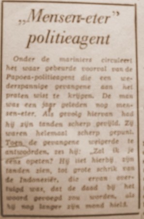 Onder de mariniers circuleert het waargebeurde voorval van de Papoea-politieagent die een wederspannige gevangene aan het praten wist te krijgen. De man was een jaar geleden nog mensen-eter. Als gevolg hiervan had hij zijn tanden scherp ,,gevijld". Zij waren helemaal scherp gepunt. Toen de gevangene weigerde te antwoorden zei hij: ,,Zal ik je eens opeten? Hij liet hierbij zijn tanden zien, tot grote schrik van de Indonesiër, die ervan overtuigd was, dat de daad bij het woord gevoegd zou worden, als hij nog langer zijn mond hield
