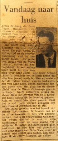 Freek(Fred de Jong) die dezer dagen thuiskomt, was eveneens marinier. Hij schreef naar huis dat hij het Nieuw-Guinea avontuur een sensatie voor zijn gehele leven vindt. Hij heeft vrij weinig klachten op zijn lijstje staan. De post kwam altijd op tijd (???) en de portvermindering viel in zeer goede aarde. ,, Ik geniet nog steeds van de mooie natuur" schreef hij herhaaldelijk. In een andere brief geeft hij zijn mening over ,, Ome Soek". Die brief begint met: ,,Even 'n berichtje om te laten horen dat alles hier ( weer ) rustig is. Men zal wel onder de indruk komen van de bedreigingen van Ome Soek, edoch blaffende honden bijten niet. Het plan om de dienstplicht voor de Nieuw-Guinea-gangers te verlengen, heeft natuurlijk allang bestaan. Maar het gevecht vd Evertsen heeft de doorslag gegeven. Ach, er heerst hier geen paniek, maar het is wel hard werken geblazen, om voortdurend gevechtsklaar te zijn.